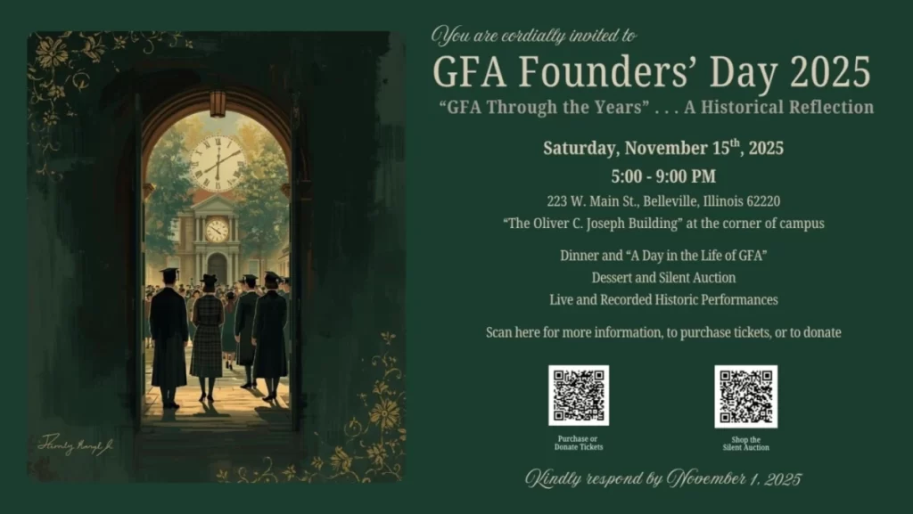 In its brief history, GFA Founder’s Day has had various forms, from a catered meal to a virtual session to hors d’oeuvres to a traditional GFA potluck supper, but all have included student presentations and alumni reminiscences. This year promises more of the same, with the return of a catered meal and silent auction.